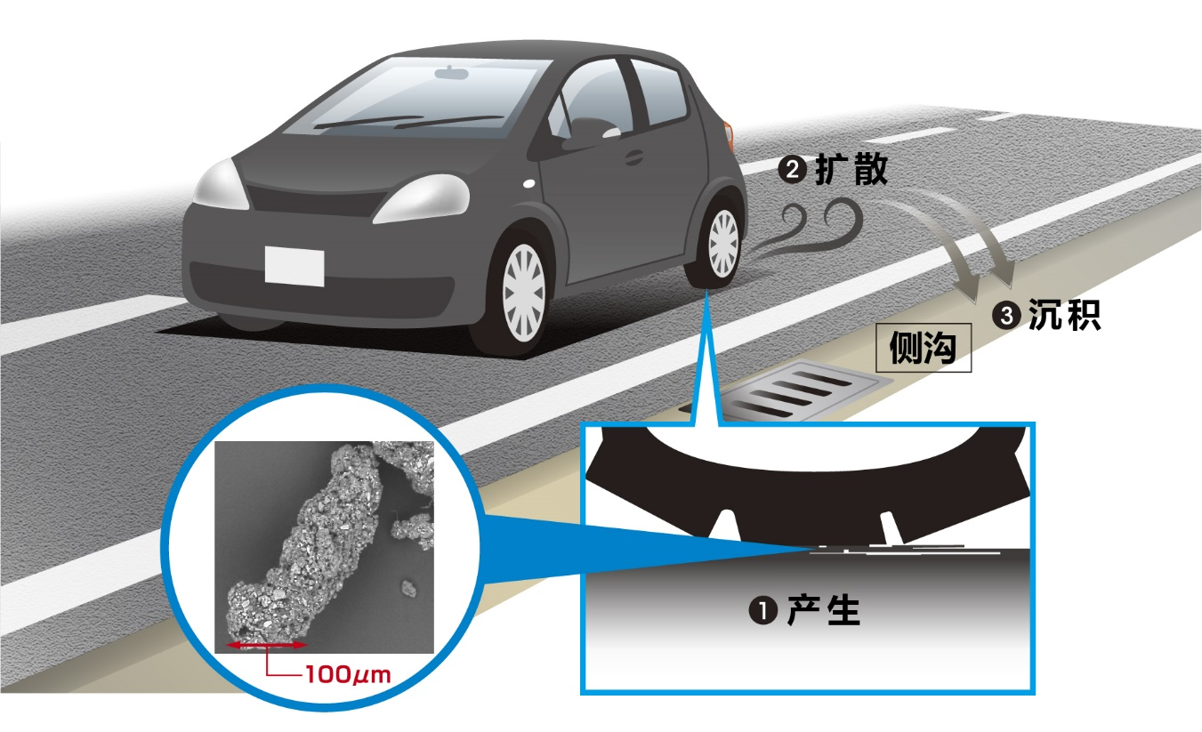 TRWP是指汽车在行驶过程中,轮胎与路面摩擦所产生的微细颗粒,主要由轮胎胎面材料与道路铺装材料混合构成。作为汽车唯一与路面直接接触的部件,轮胎在保障行车安全的同时,也不可避免地在“起步”“转弯”“制动”等过程中产生TRWP。这些颗粒会经历“产生 → 扩散 → 沉积”的过程,可能对空气、水体及生态系统造成潜在影响。