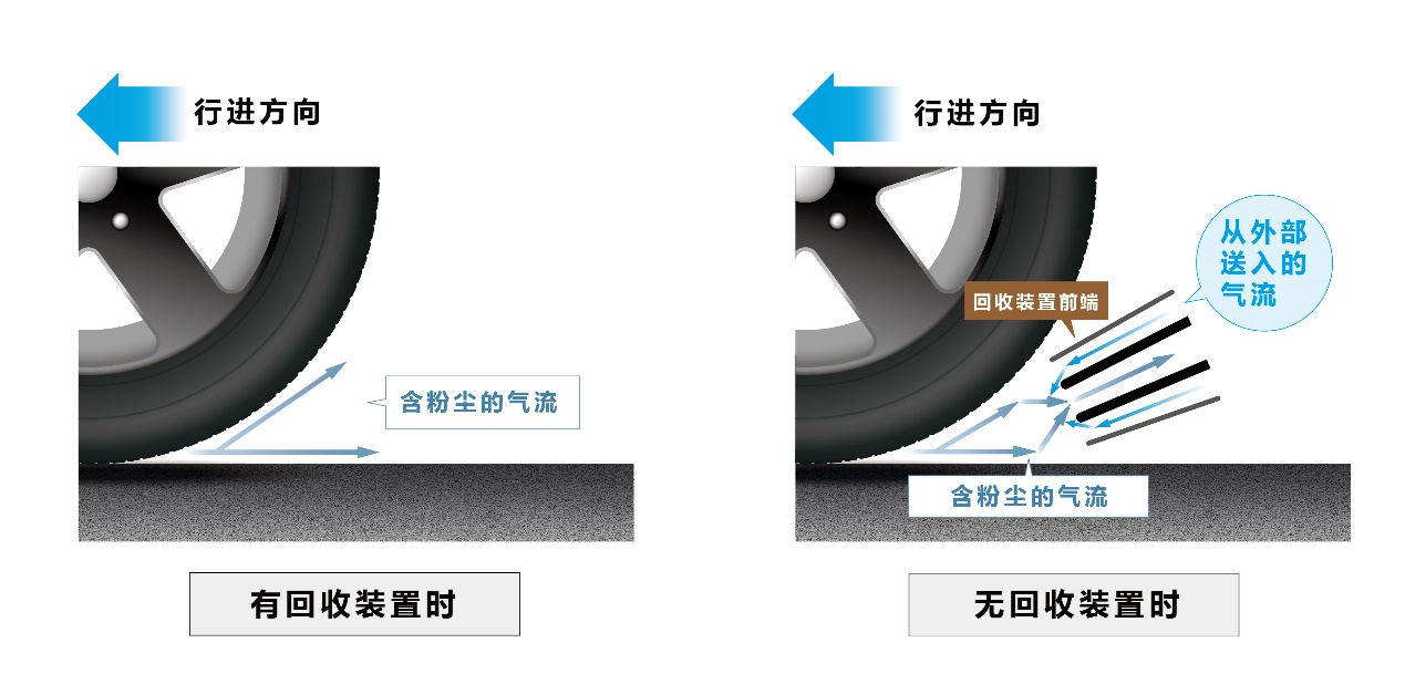 针对TRWP扩散阶段,住友橡胶与德国东法利亚应用科学大学空气动力学专家Falk Klinge教授合作,开发出一种利用车辆行驶中气流变化的TRWP回收装置。该装置可通过引导轮胎周边气流,有效捕集因摩擦产生的微细颗粒。